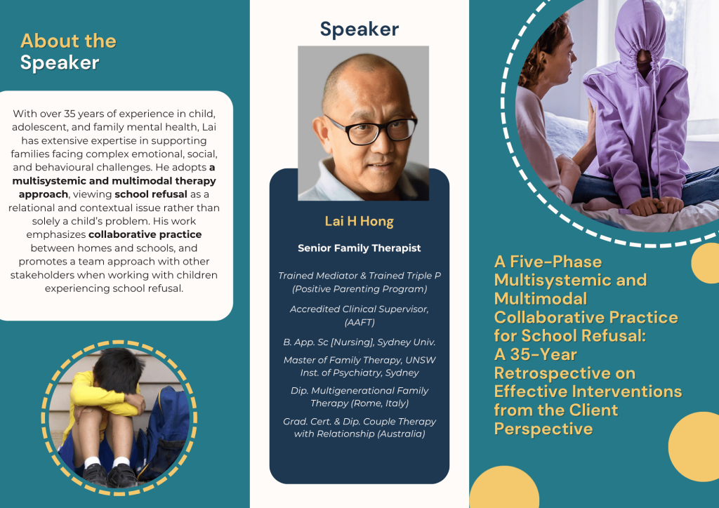 This webinar introduces the SRIMM model, a five-phase framework for supporting children experiencing school refusal. Drawing on 35 years of clinical experience, Mr Lai shares practice-based insights into collaborative reintegration strategies that rebuild trust, restore confidence, and enhance emotional safety.